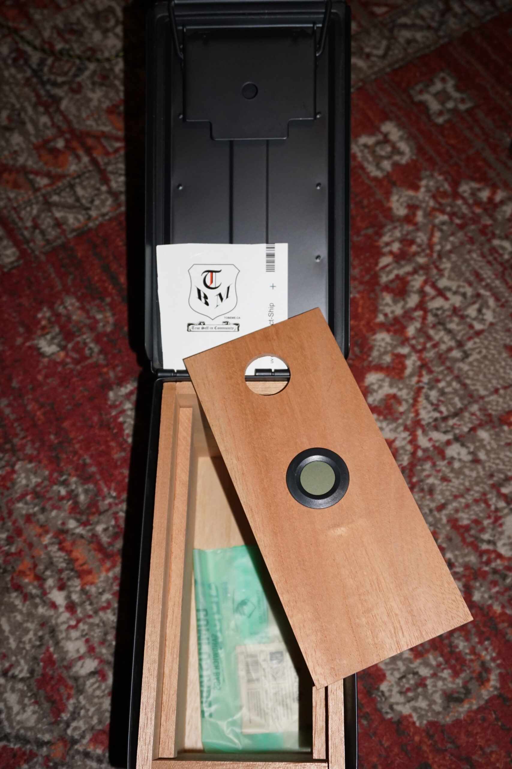 This humidor-style ammo box combines the rugged durability of a black metal ammo can with a wooden humidor insert, made of Spanish cedar. The removable lid features a built-in hygrometer and ventilation hole for humidity control, while a Boveda humidity pack inside helps maintain optimal conditions for cigars. With its military aesthetic and cigar-preserving function, this unique piece is both practical and stylish.