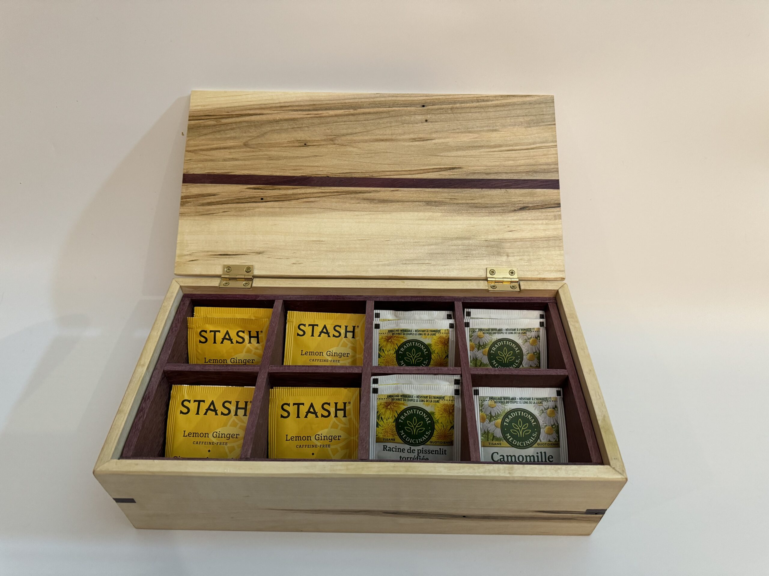 A wooden tea box with a hinged lid, designed for organizing and storing tea bags. The box is crafted from light-colored wood with a natural grain pattern, featuring a darker wooden inlay stripe running horizontally across the lid for aesthetic contrast. The hinges are small, made of brass.